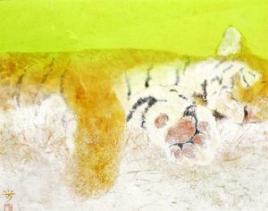 松岡歩はシロクマやライオン、あるいは水辺の生き物など、主に動物をモチーフとして描く。しかし彼の目的は、単なる動物画の探求ではない。その真髄は、動物たちの姿を借りて、自身の体験から生まれた感情や記憶といった、形のないものを表現することにある。